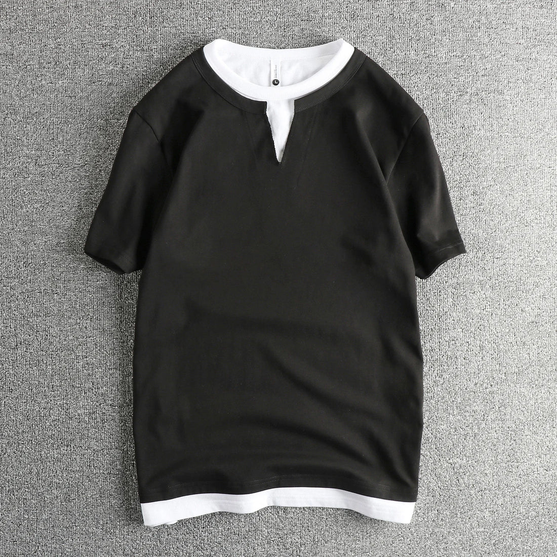 2025 Summer American Retro Short Sleeve V-neck Fake Two Pieces Solid Color T-shirt Men's 100% Cotton Washed Youth Casual Tops