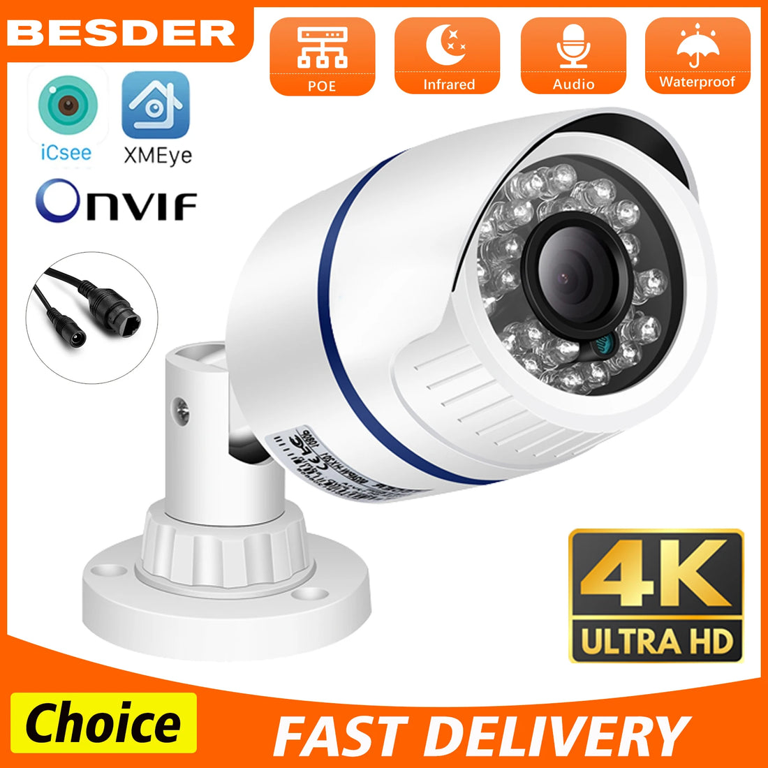 8MP Outdoor IP66 Waterproof POE 4K IP Camera UltraHD Bullet Type Metal White Security Camera Night Vision