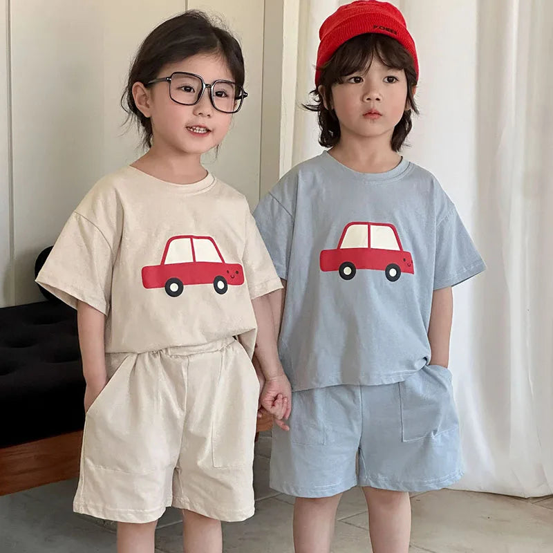 New Summer Kids Clothes Suit Children Cute Cartoon Car T-shirt + Shorts Boys Thin Style 2PCS Outfit 1-4Y Unisex
