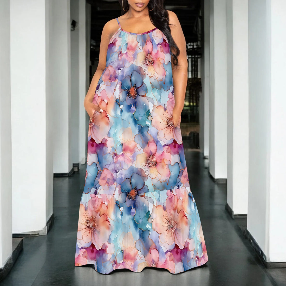 Watercolor Floral Print Sleeveless Maxi Dress Women Casual Beach Style Spaghetti Strap Outfit