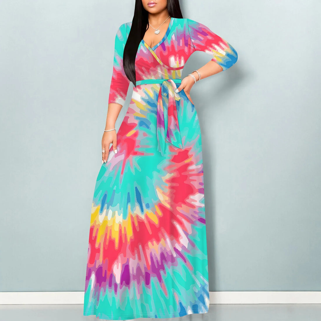 Colorful Tie-Dye V-Neck 3/4 Sleeve Wrap Maxi Dress with Belt - Women's Bold Bohemian Party Evening Resortwear