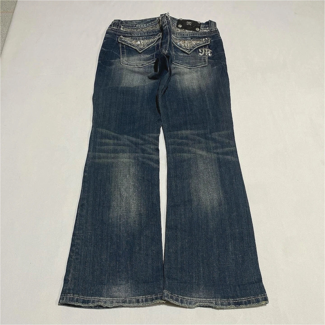 Women's Gothic Jeans Y2K Clothes Harajuku Hip Hop Pocket Embroidery Vintage Dark Blue Baggy Jeans High Waist Slim Flared Trousers