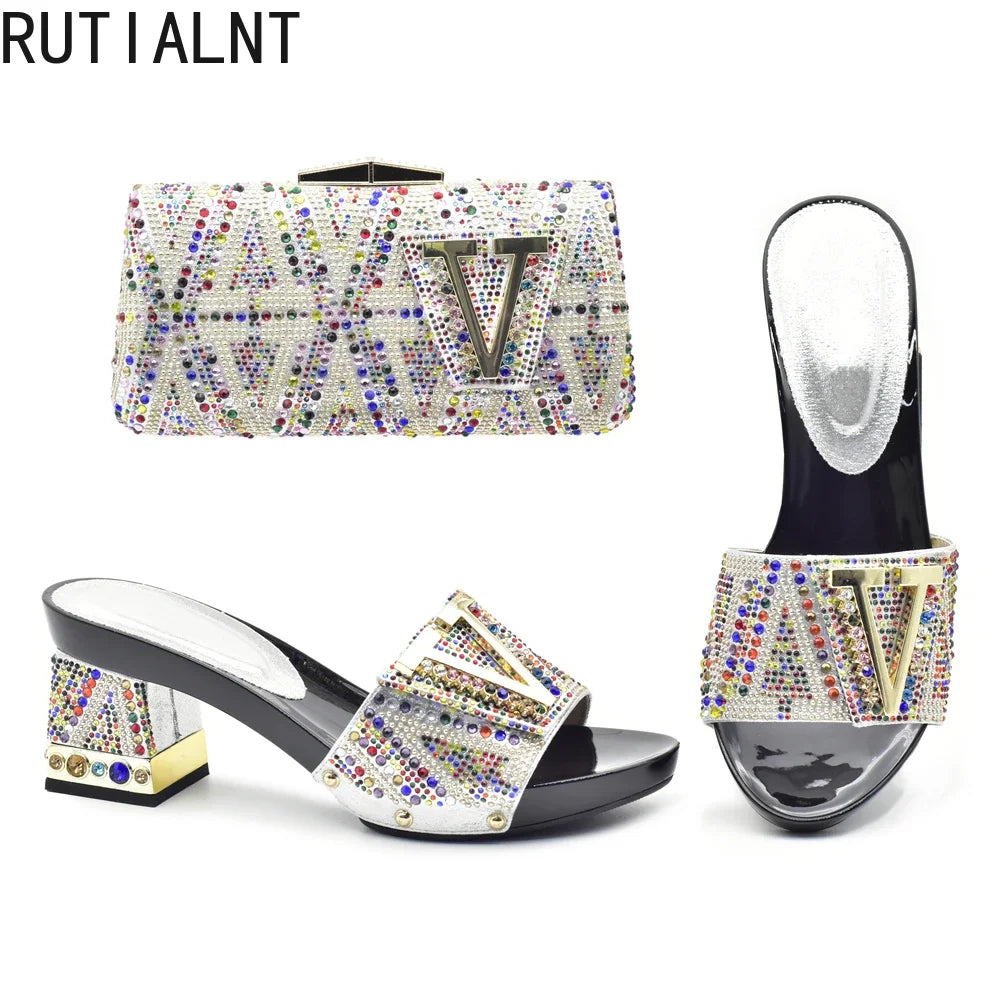 Matching Nigerian Party Shoes and Bags for Ladies Elegant Heeled Shoes for Women Rhinestone African Bag and Shoe Set