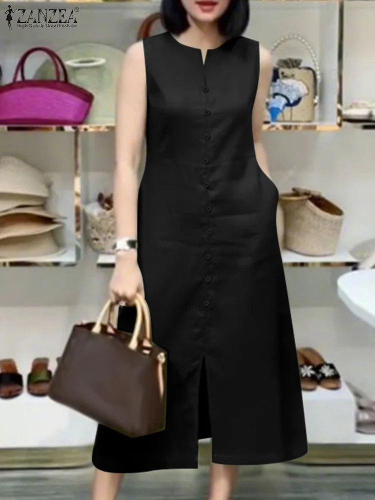 2025 Women Summer Sundress Elegant Work OL Midi Dresses V Neck Sleeveless Solid Dress Fashion Buttons Down Robe Plus Size