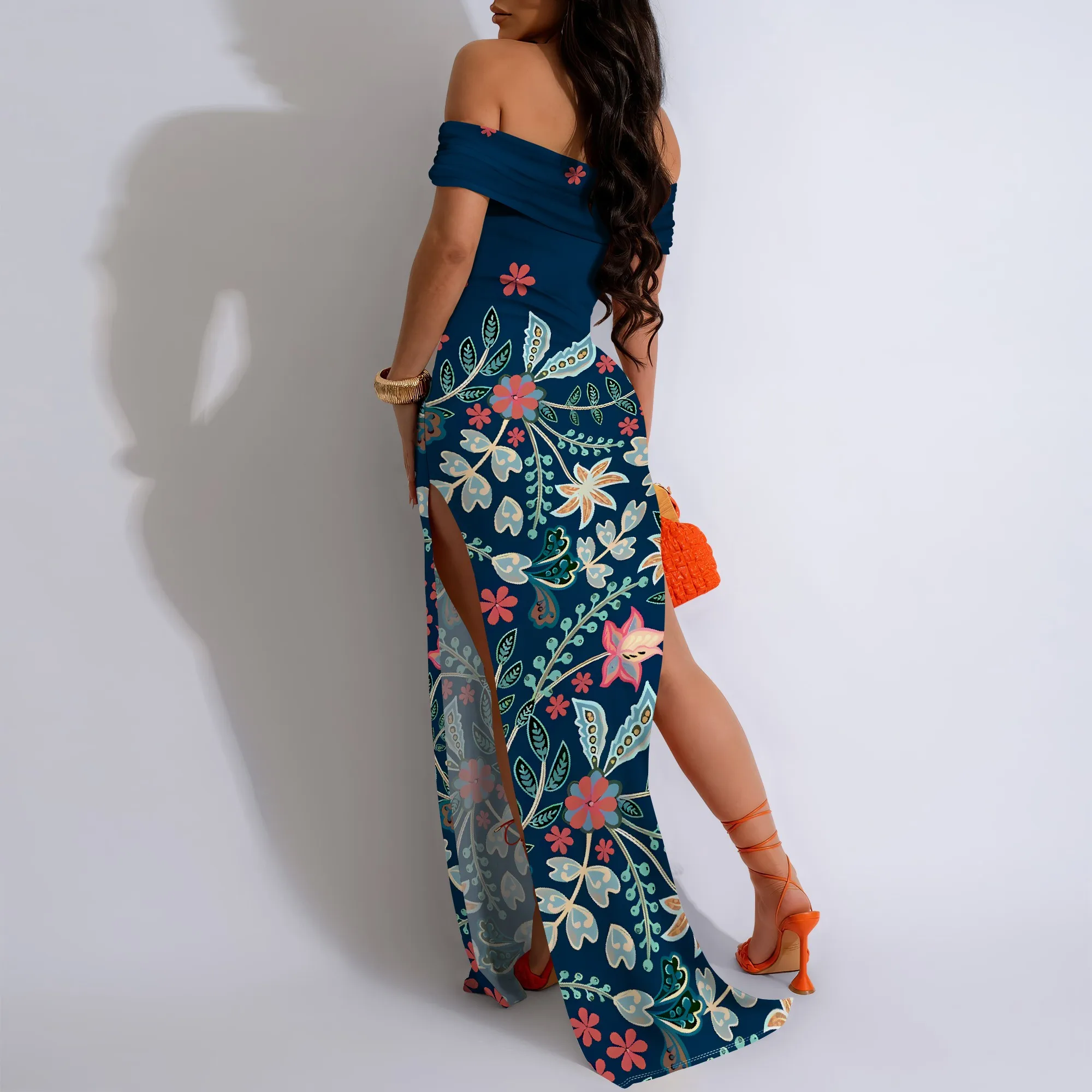Black White Speckled Off-Shoulder High Slit Maxi Dress - Women's Modern Stylish Party Evening Resortwear