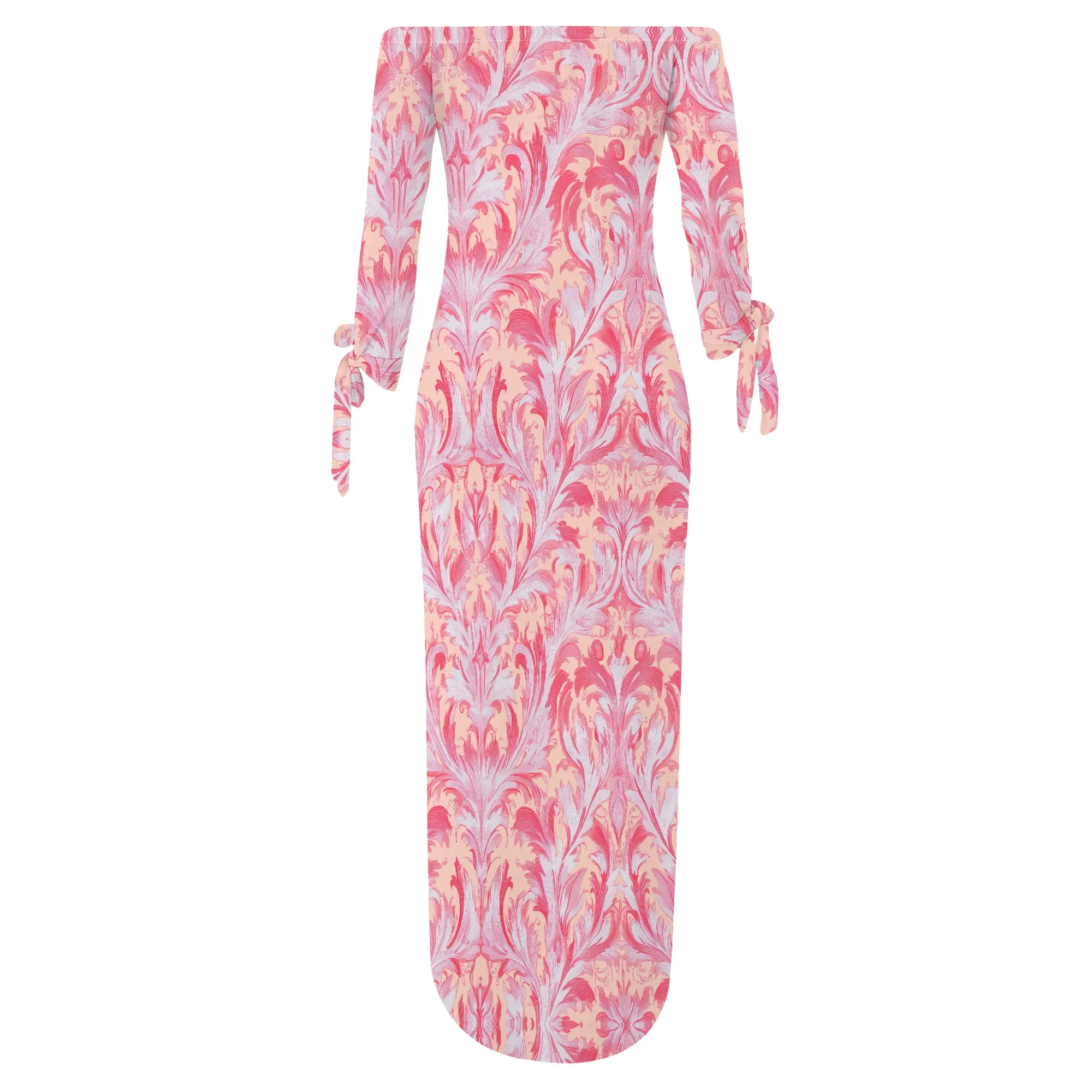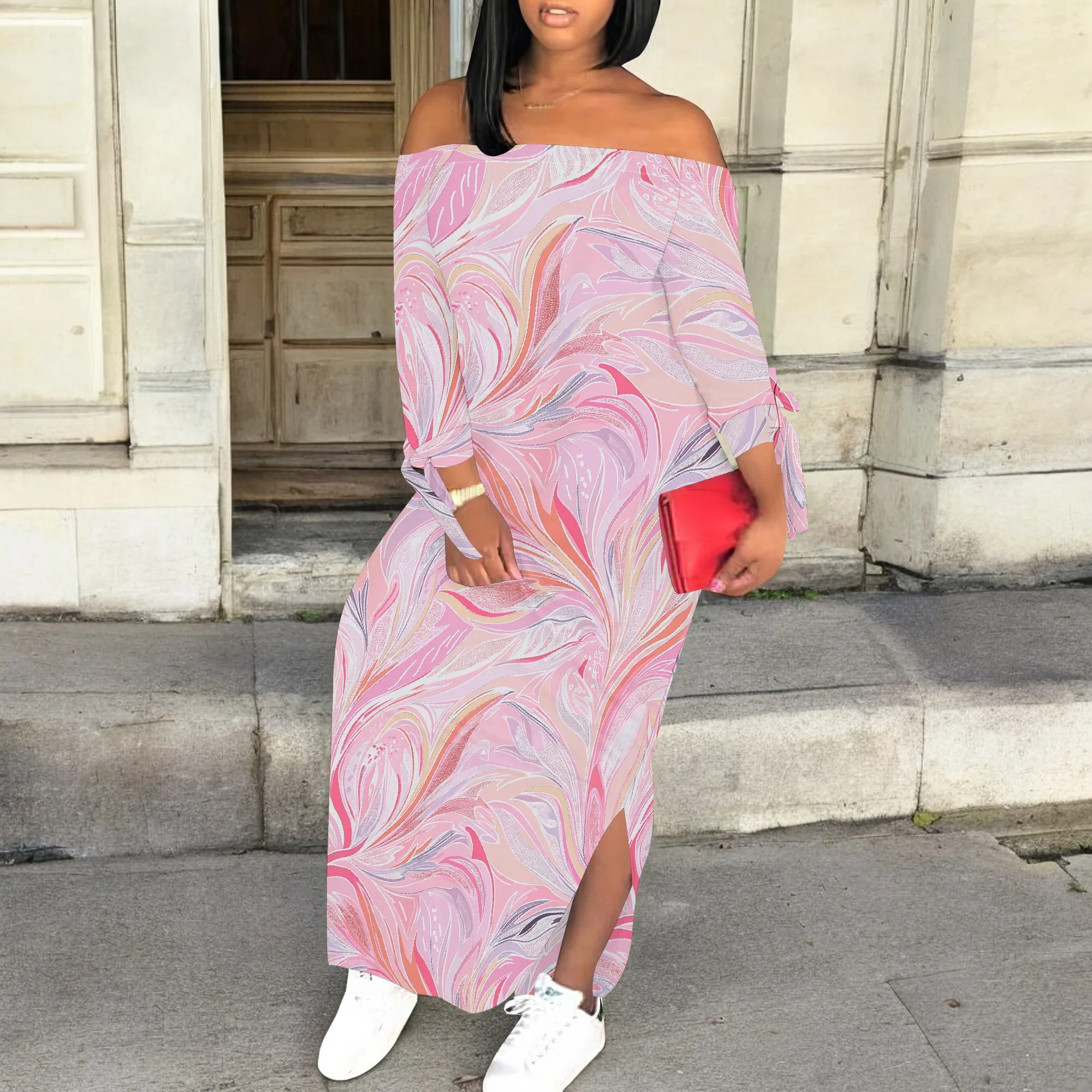 Casual Pink Butterfly Print Maxi Dress Off Shoulder Long Sleeve Bodycon Dress for Women Spring Vacation Style