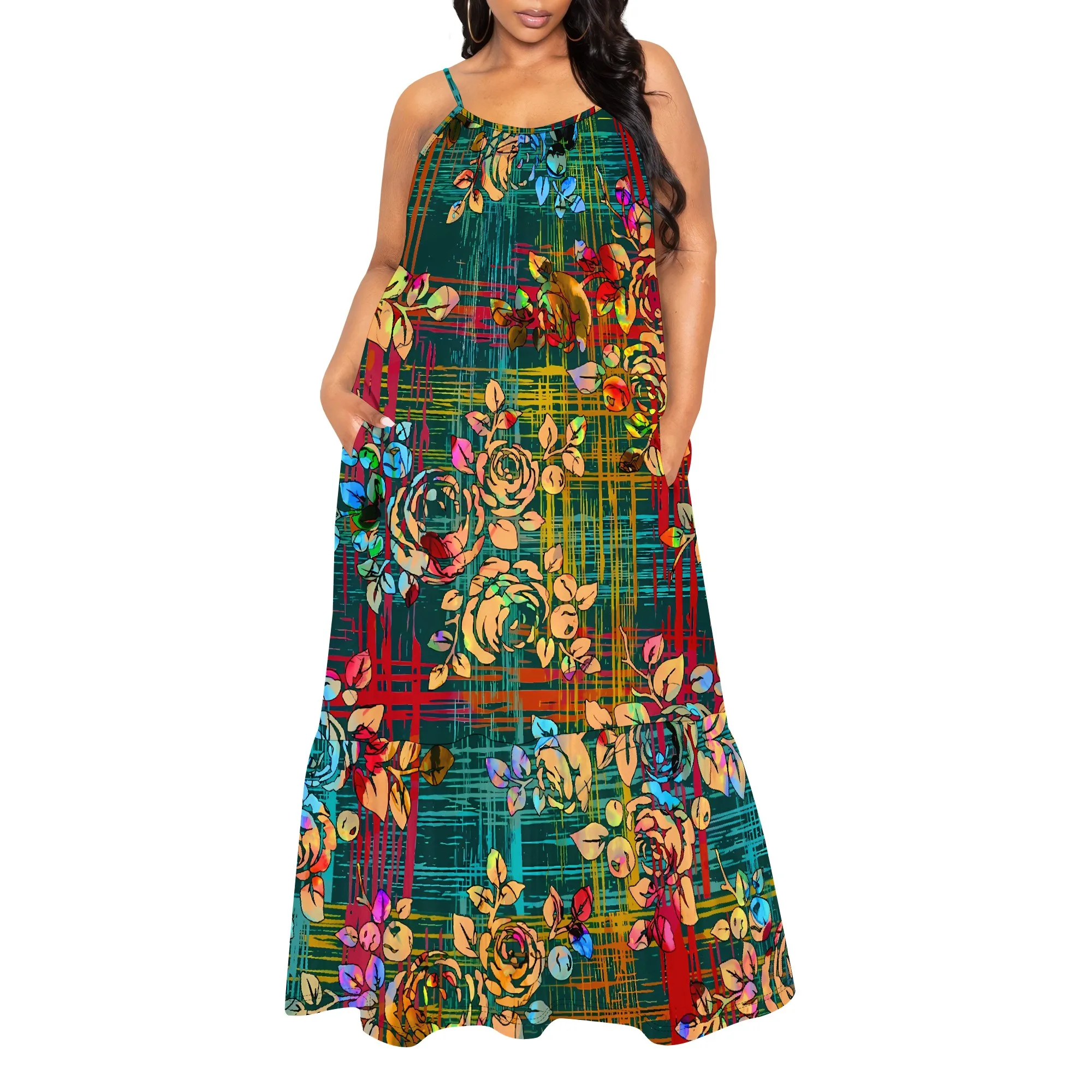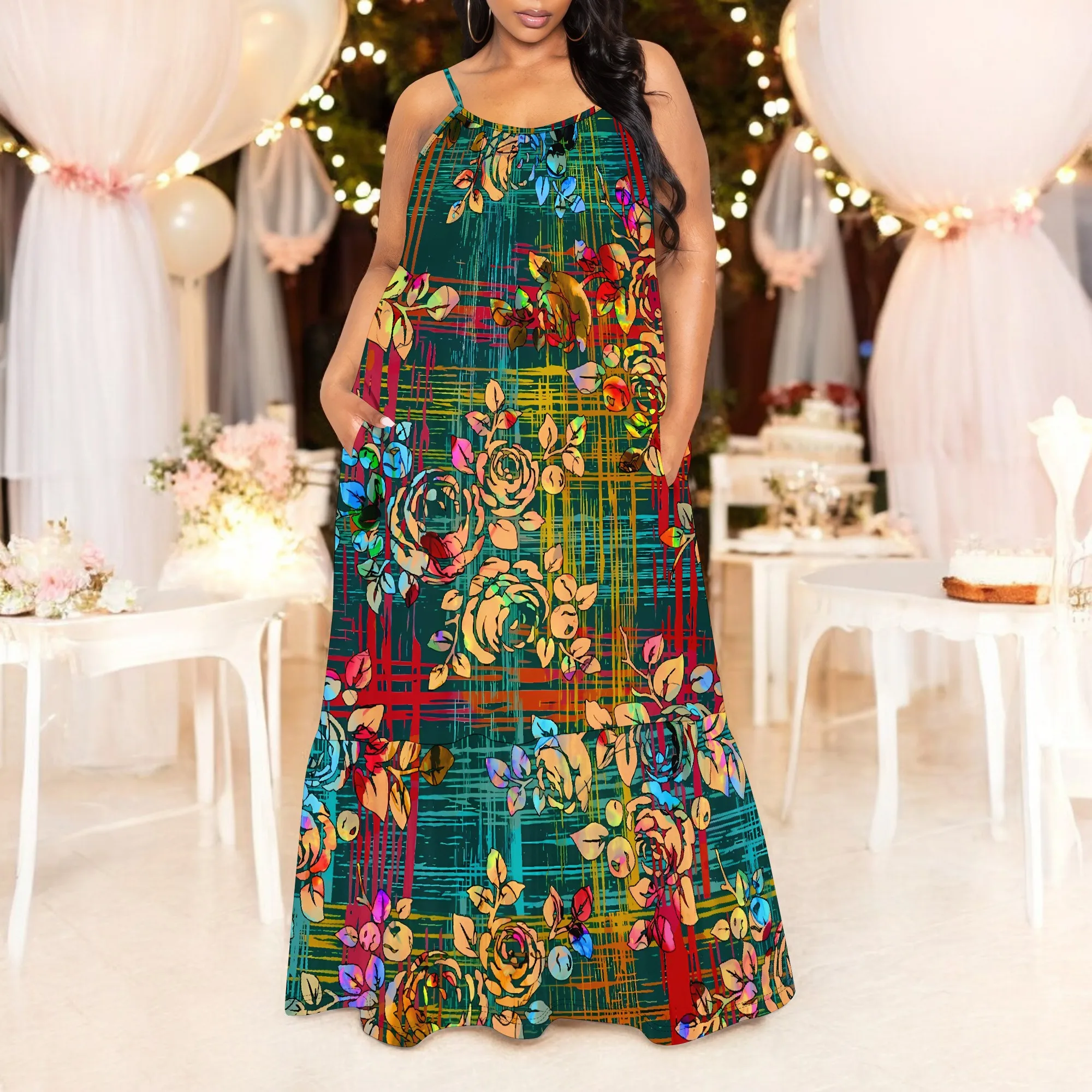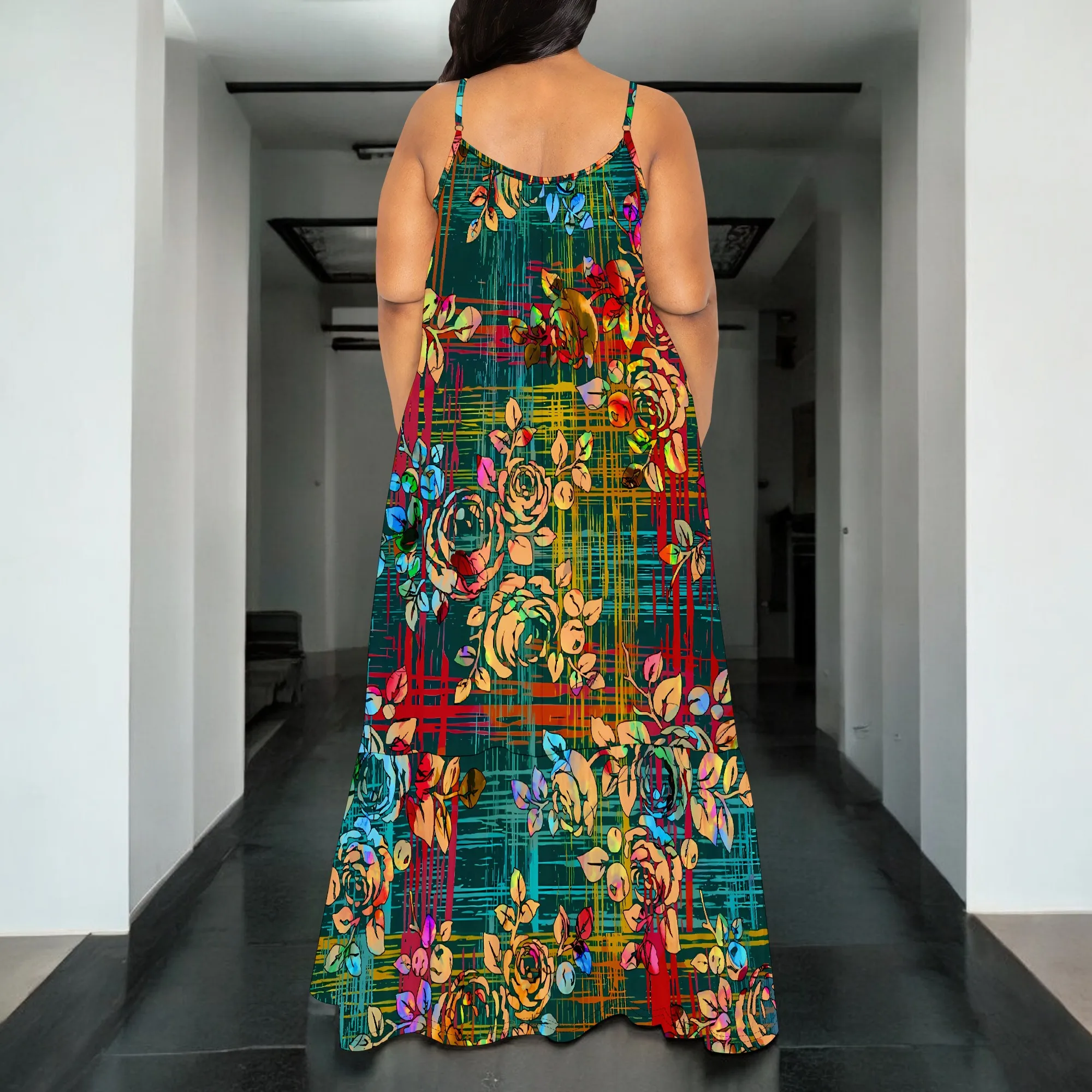 Colorful Plaid Floral Maxi Dress for Women Sleeveless Casual Spaghetti Strap Vacation Outfit