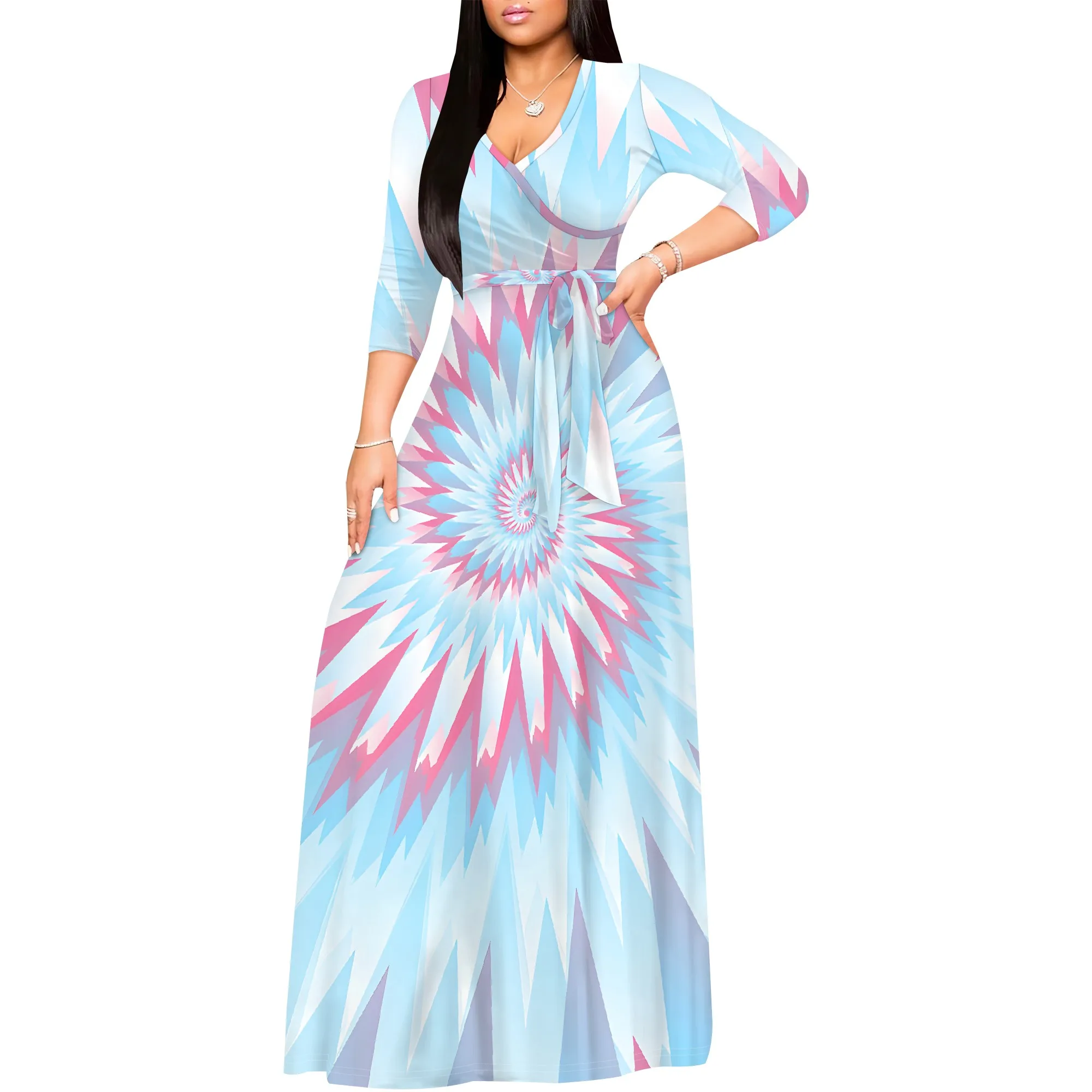Colorful Tie-Dye V-Neck 3/4 Sleeve Wrap Maxi Dress with Belt - Women's Bold Bohemian Party Evening Resortwear