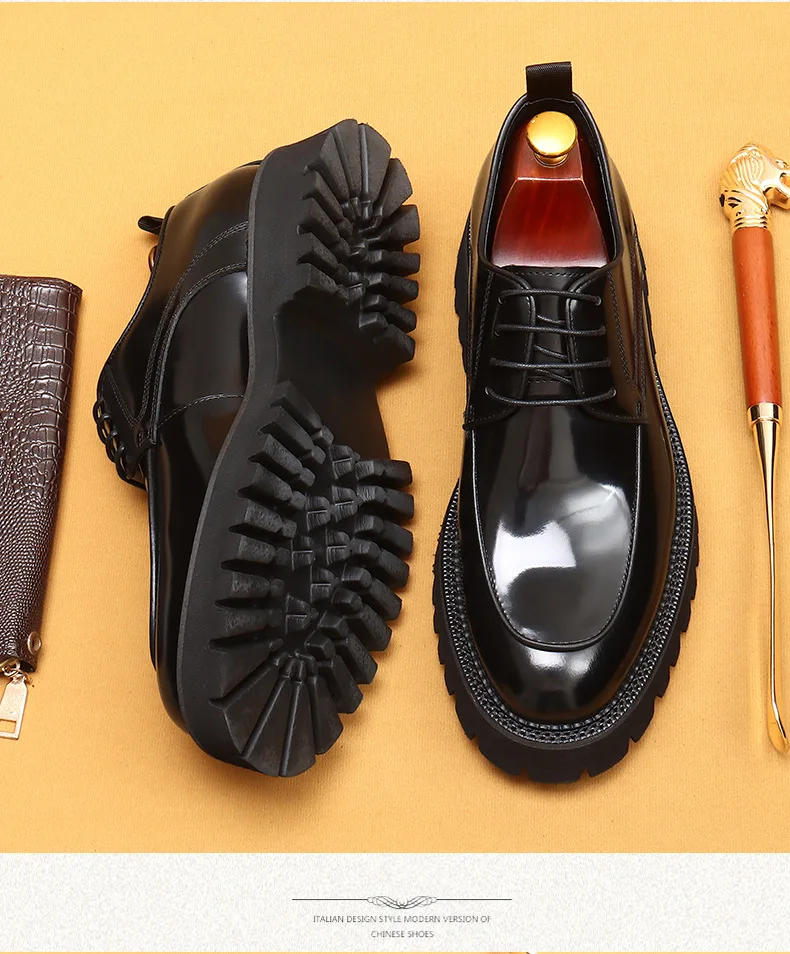 Designer Men's Leather Shoes With Thick Soles Round Toe Glossy Leather Business Dress and Waxed Cowhide Lace-Up British Shoes