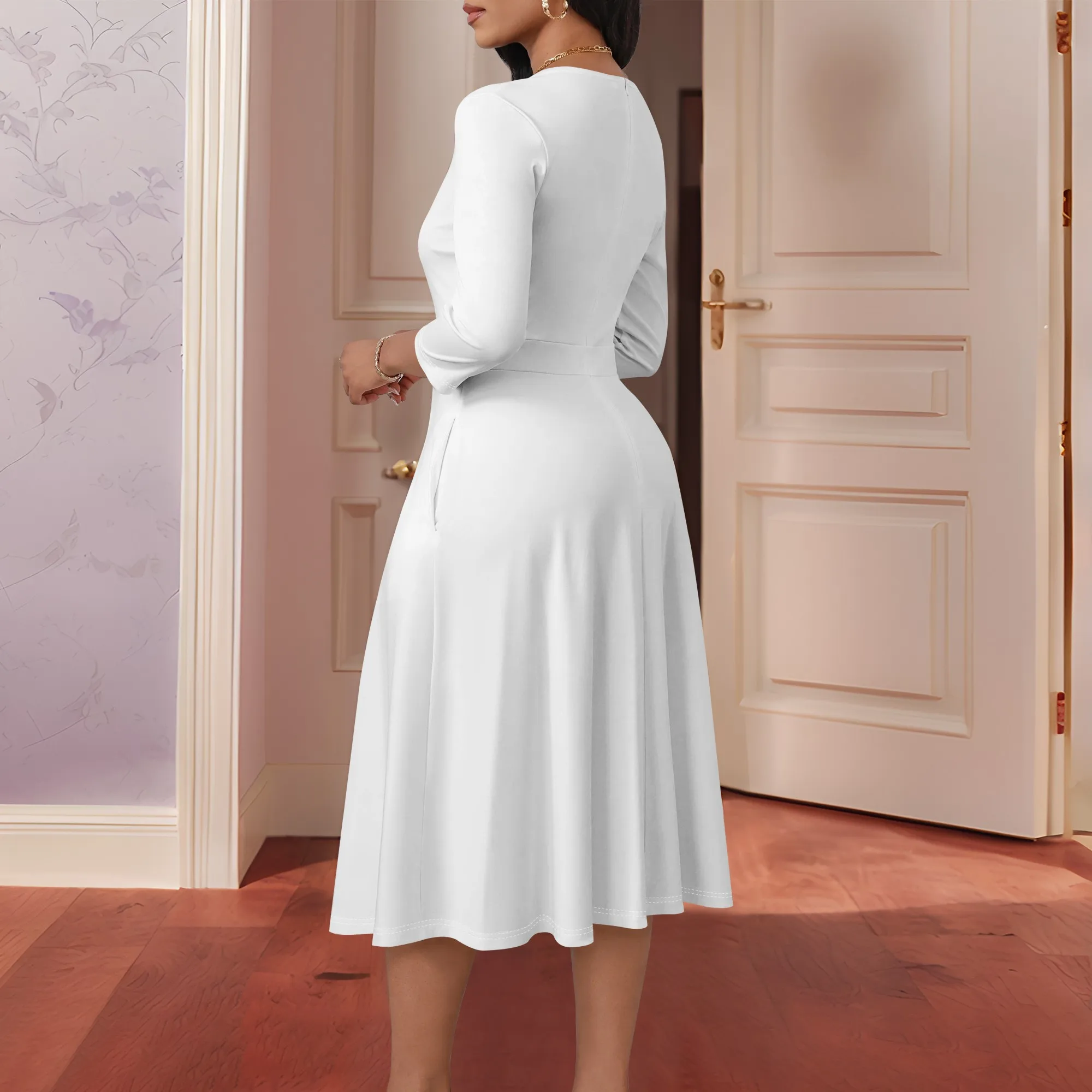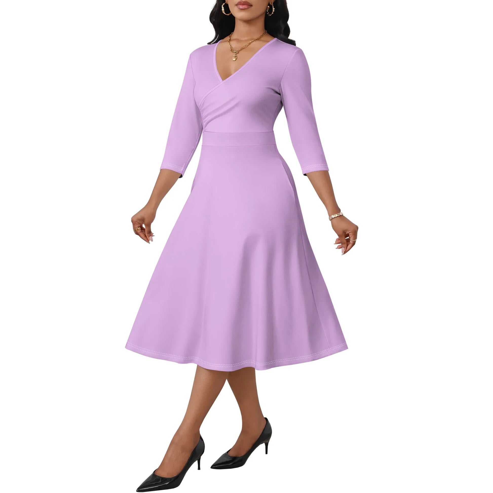 Ladies' casual flared midi dress, wedding guest cocktail tea party dress, A-line swing V-neck, three-quarter sleeves.