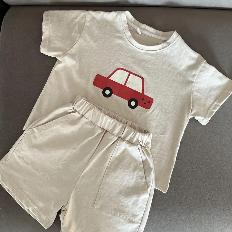 New Summer Kids Clothes Suit Children Cute Cartoon Car T-shirt + Shorts Boys Thin Style 2PCS Outfit 1-4Y Unisex