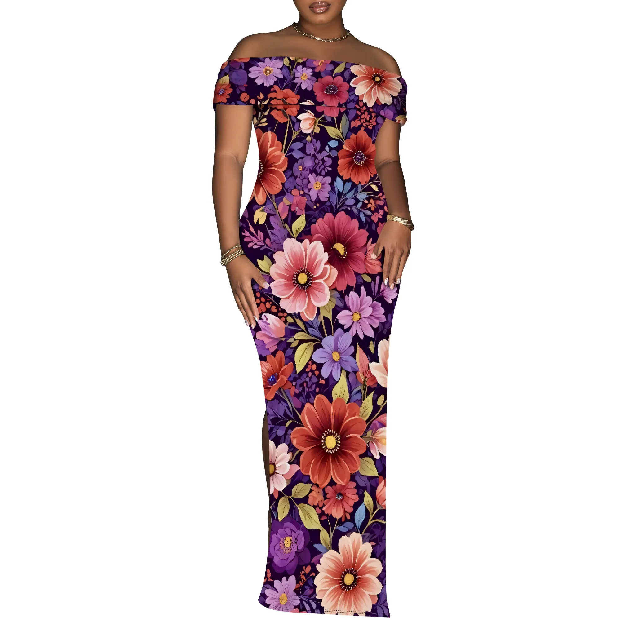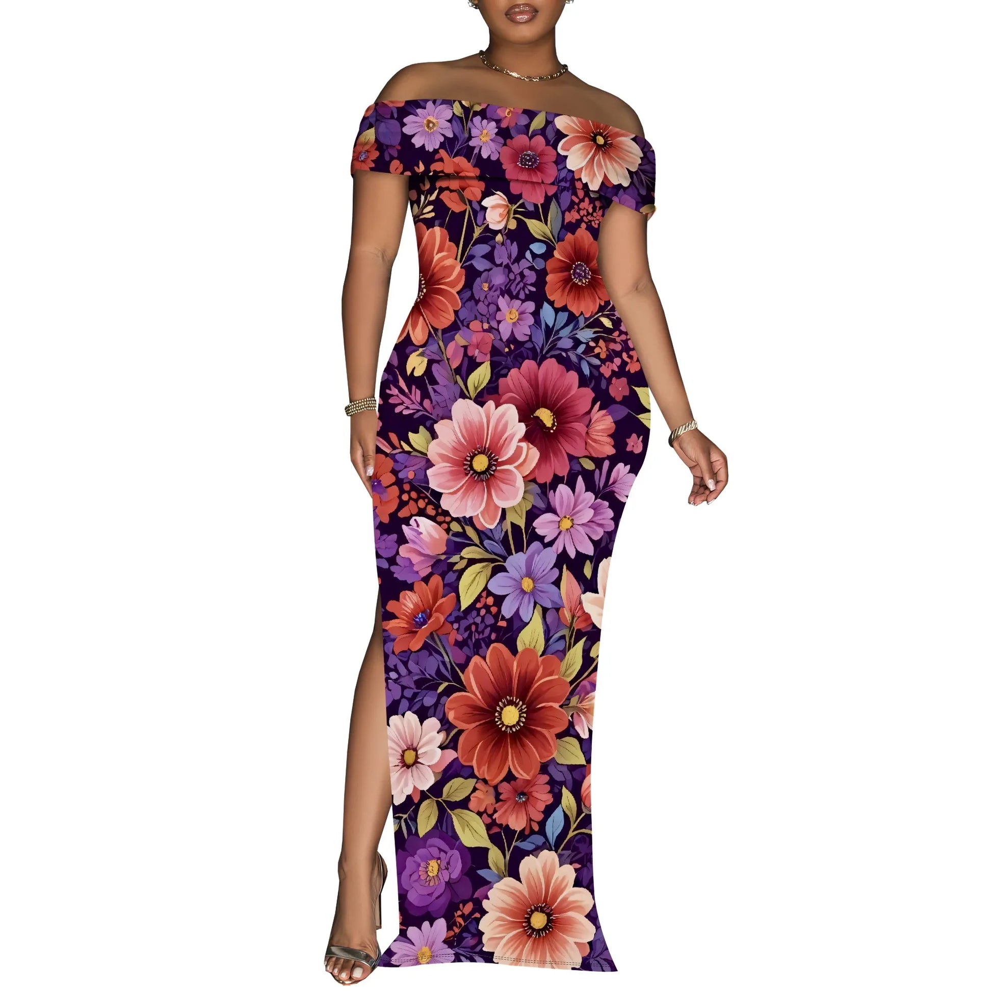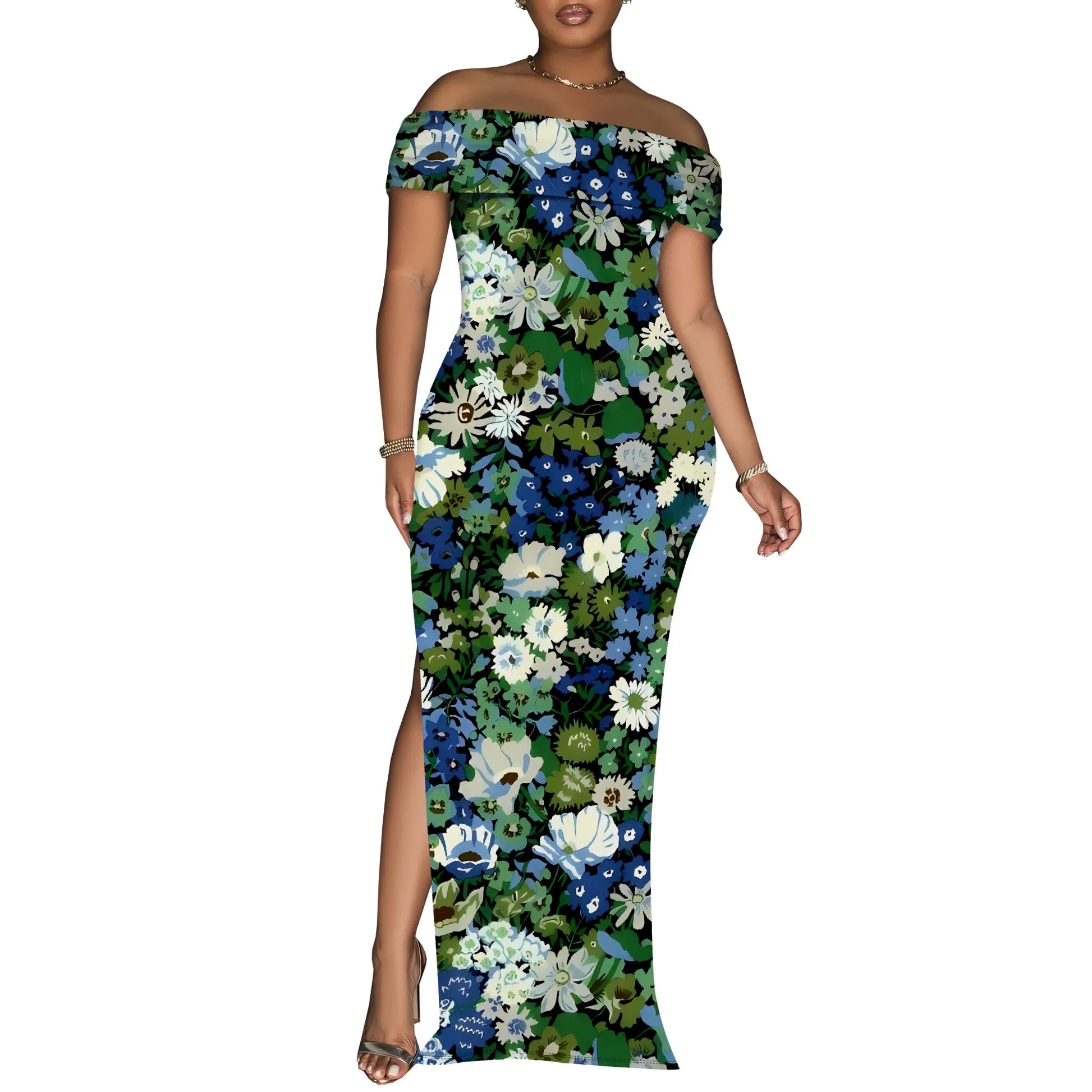Off Shoulder Bodycon Maxi Dress for Women Floral Print Summer Elegant Party Dress Slim Fit Slit Gown
