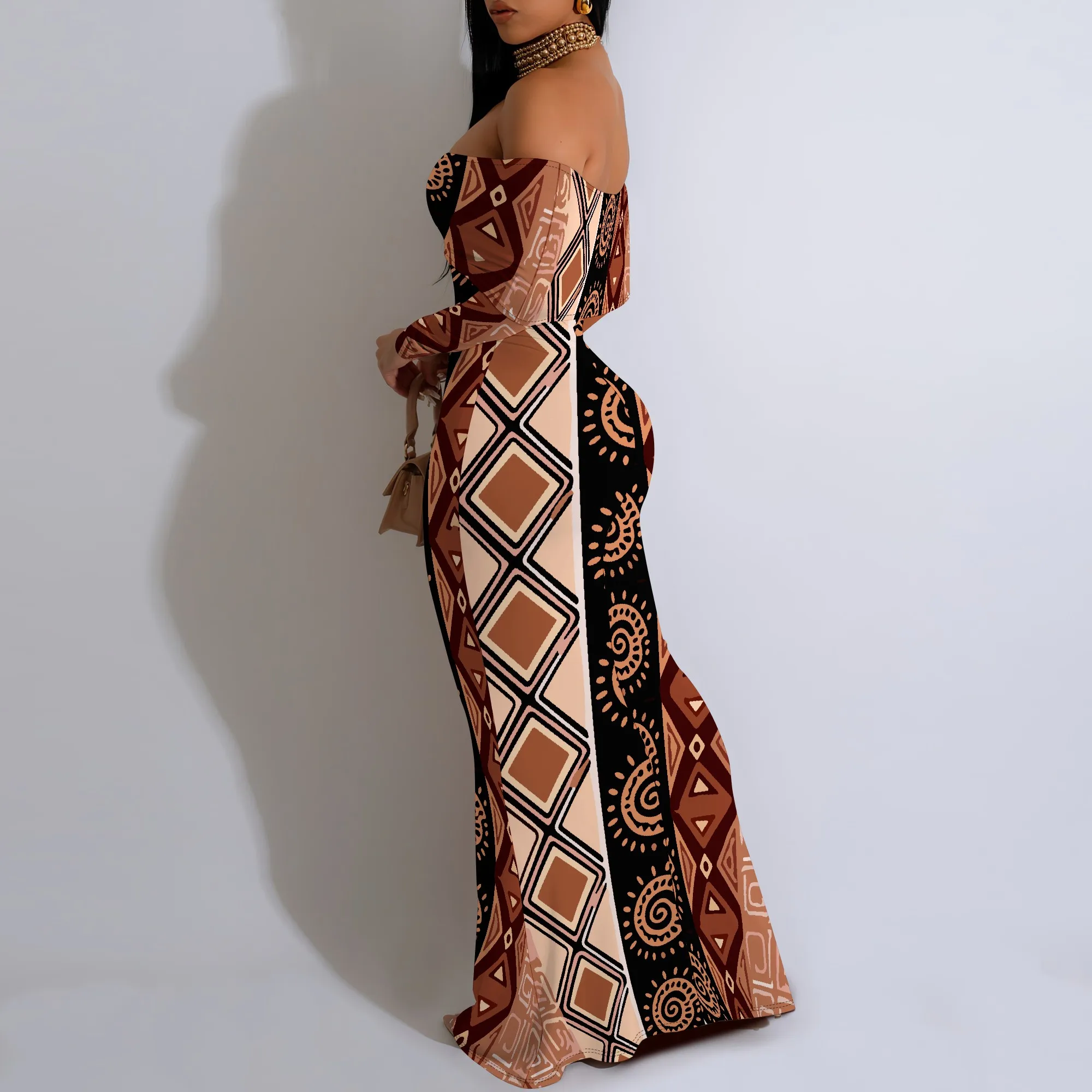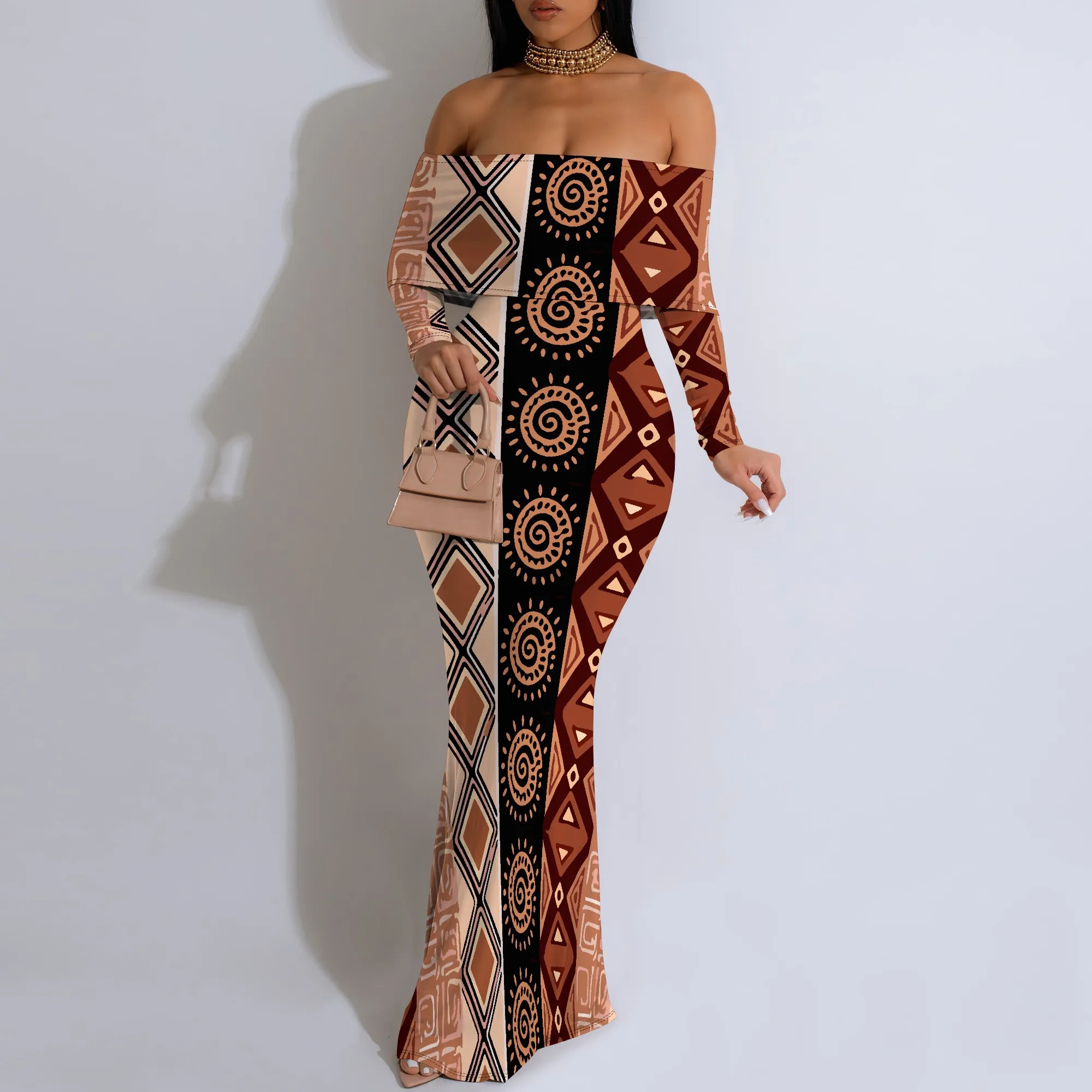 Off Shoulder Maxi Dress Blue Purple Glitter Print Bodycon Long Sleeve Gown