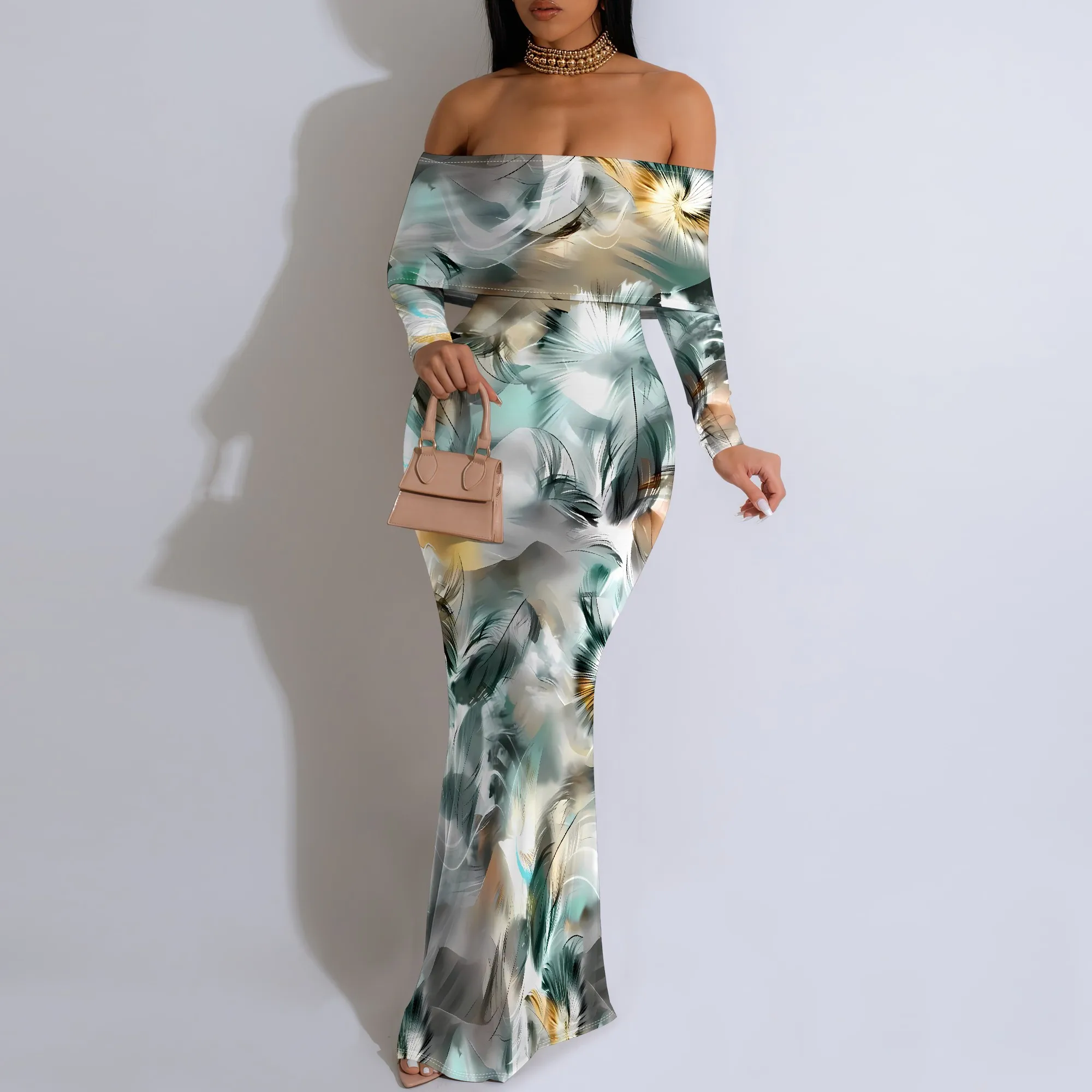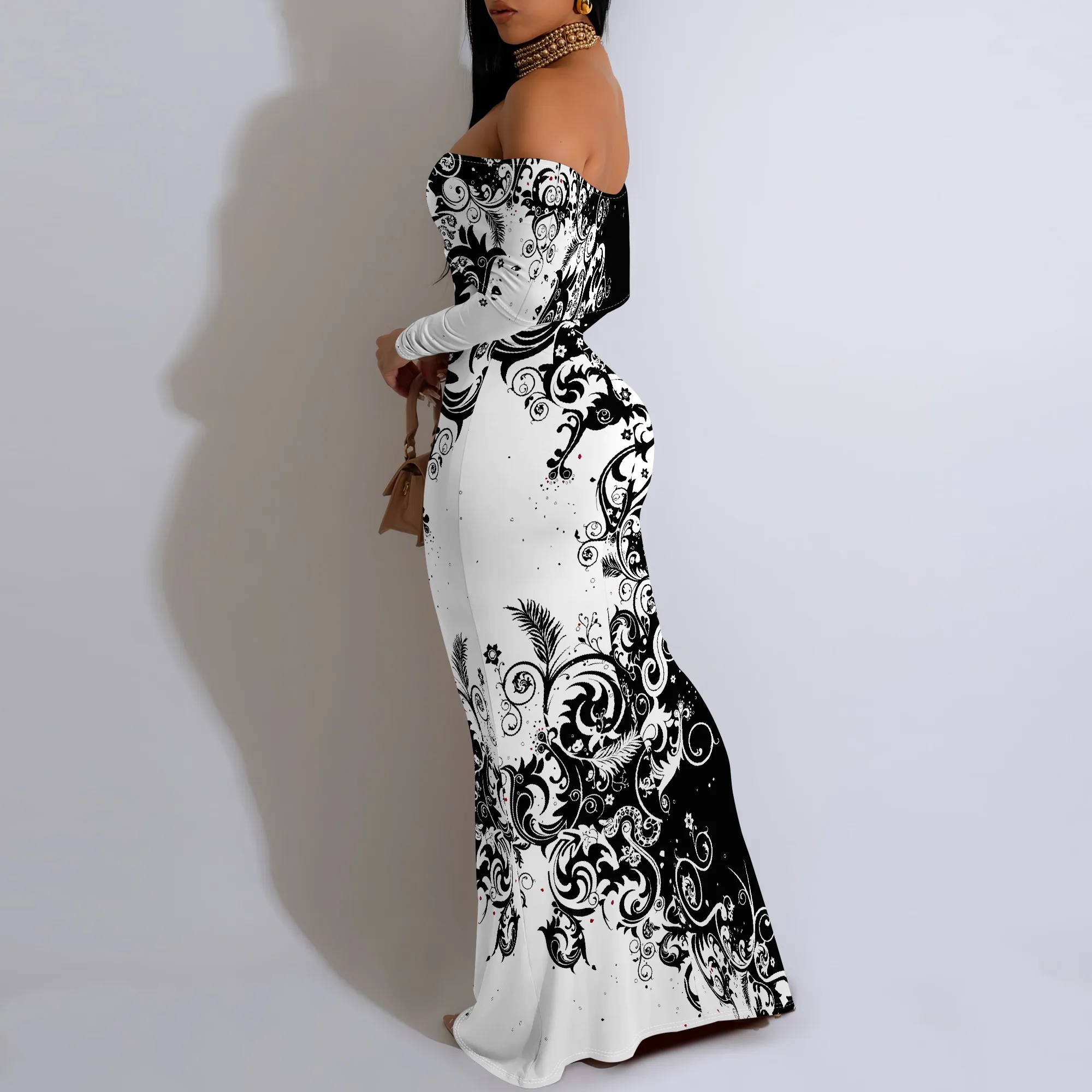 Plus Size Black White Floral Off-Shoulder Long Sleeve Maxi Dress - Women's Dramatic Elegant Party Evening Resortwear