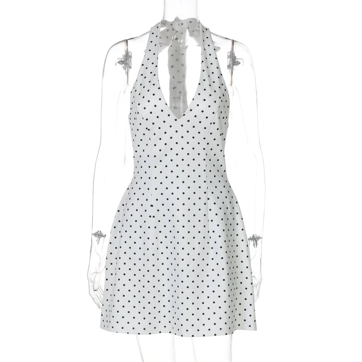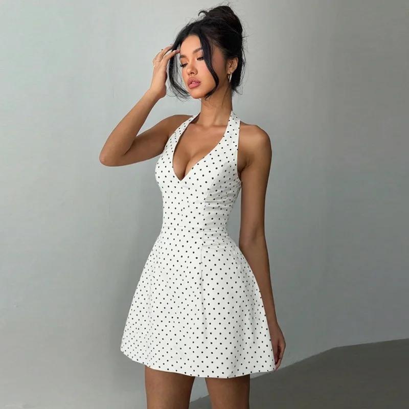 Polka Dot Printed Halter Dress Women's Sexy V neck Backless Mini Dress High Waist Bodycon Summer Fashion Vacation Dress