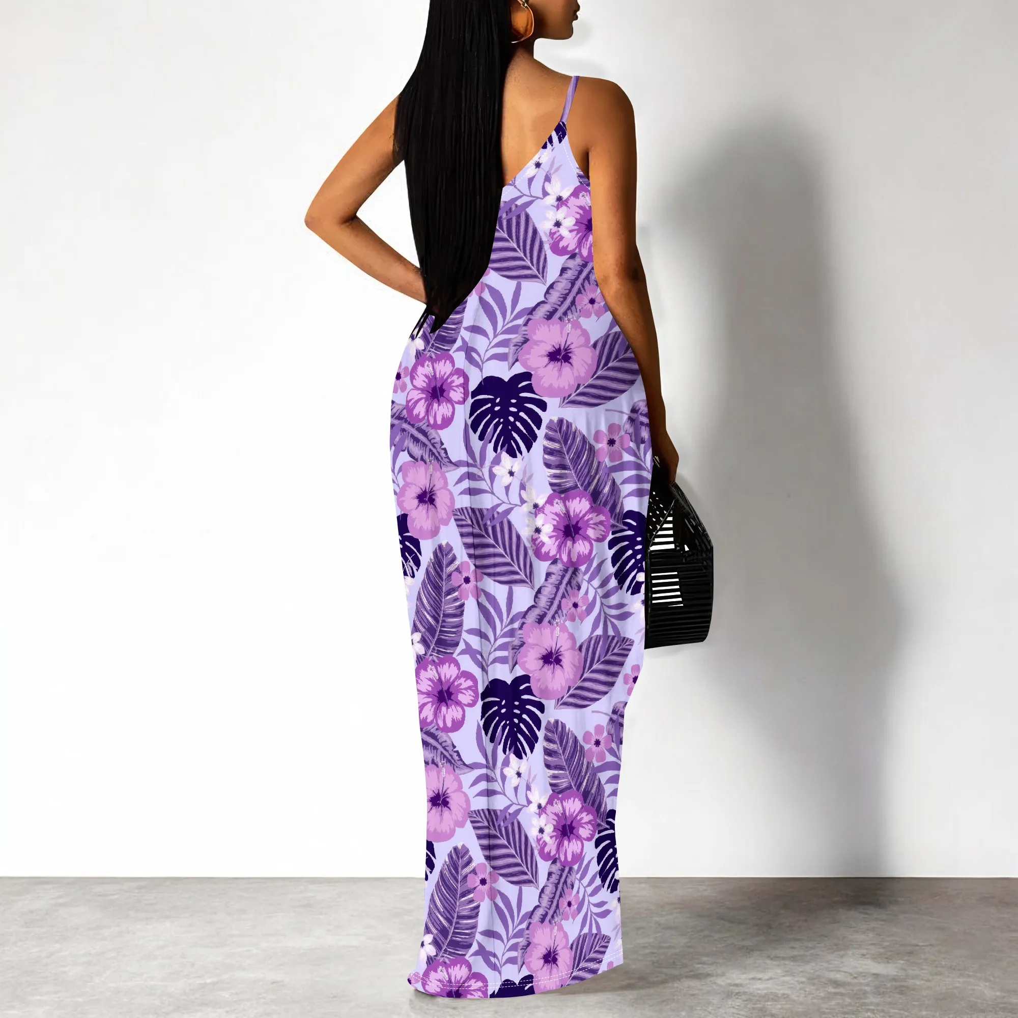 Purple Floral Print Spaghetti Strap Maxi Dress Women Tropical Sleeveless Summer Look