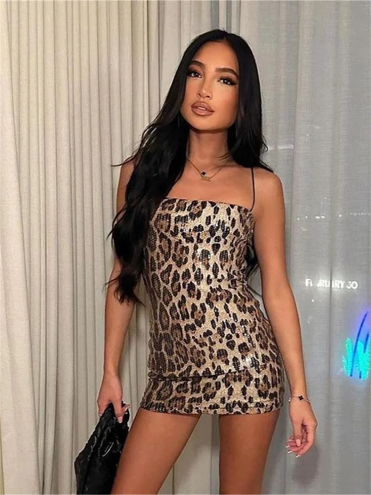 Shine Sequins Dress Women Leopard Print Hipster Backless Skinny Midnight Club Party Sexy Coquette Classic Mini Bodycon