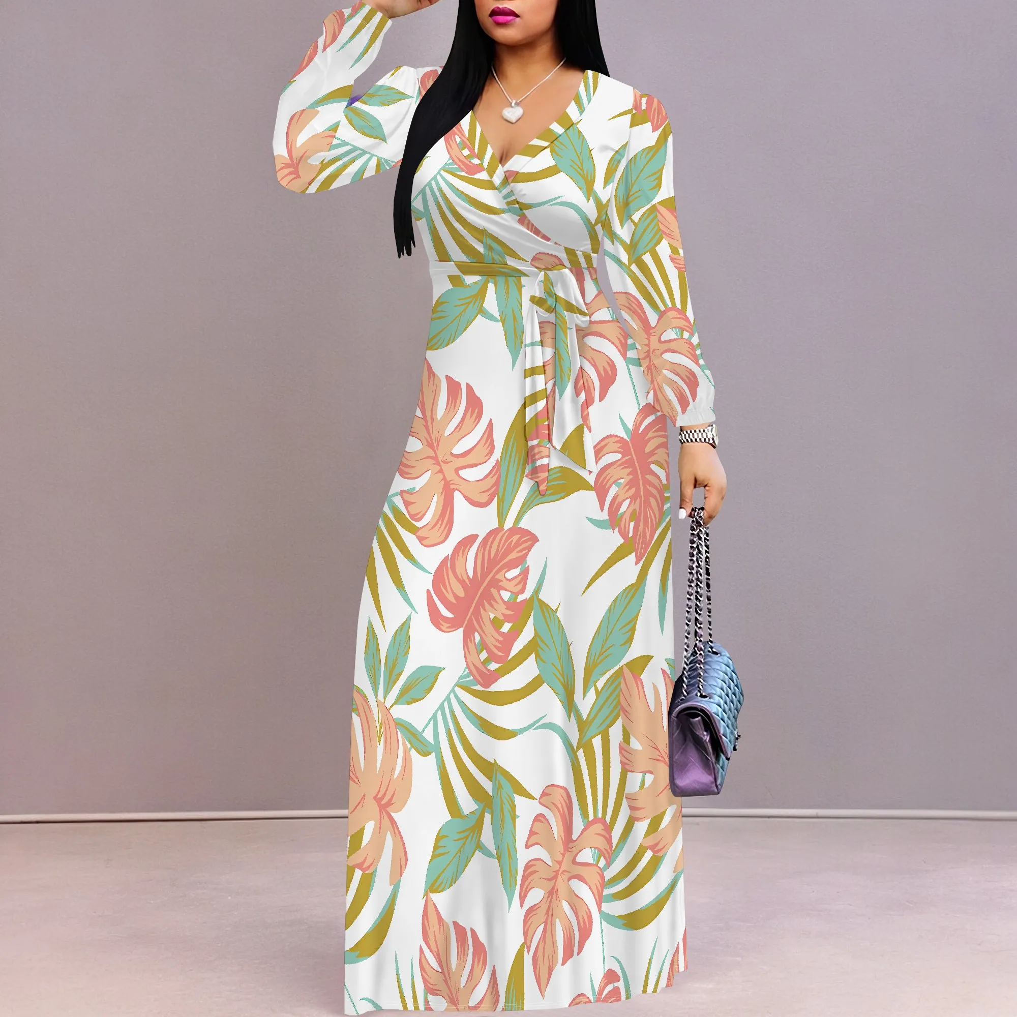 Standard Size Long Sleeve V Neck Maxi Dress White Tropical Leaf Print Casual Vacation Outfit