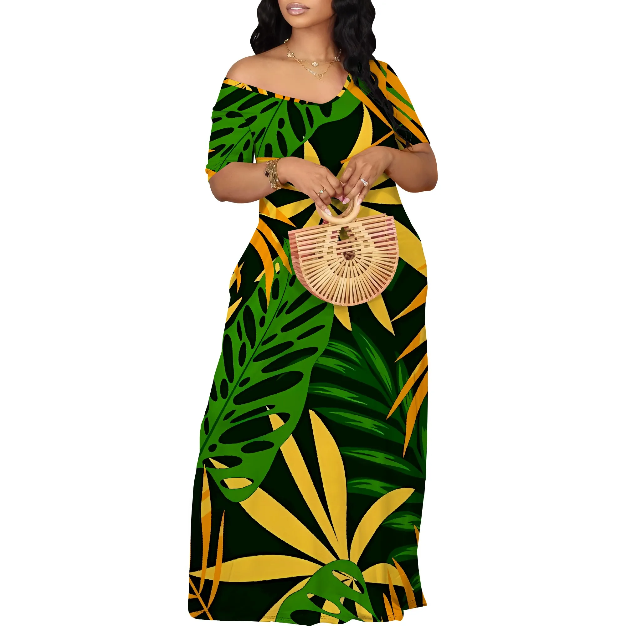 Summer Off Shoulder Maxi Dress Green Yellow Bold Leaf Print Women Holiday Beach Dress