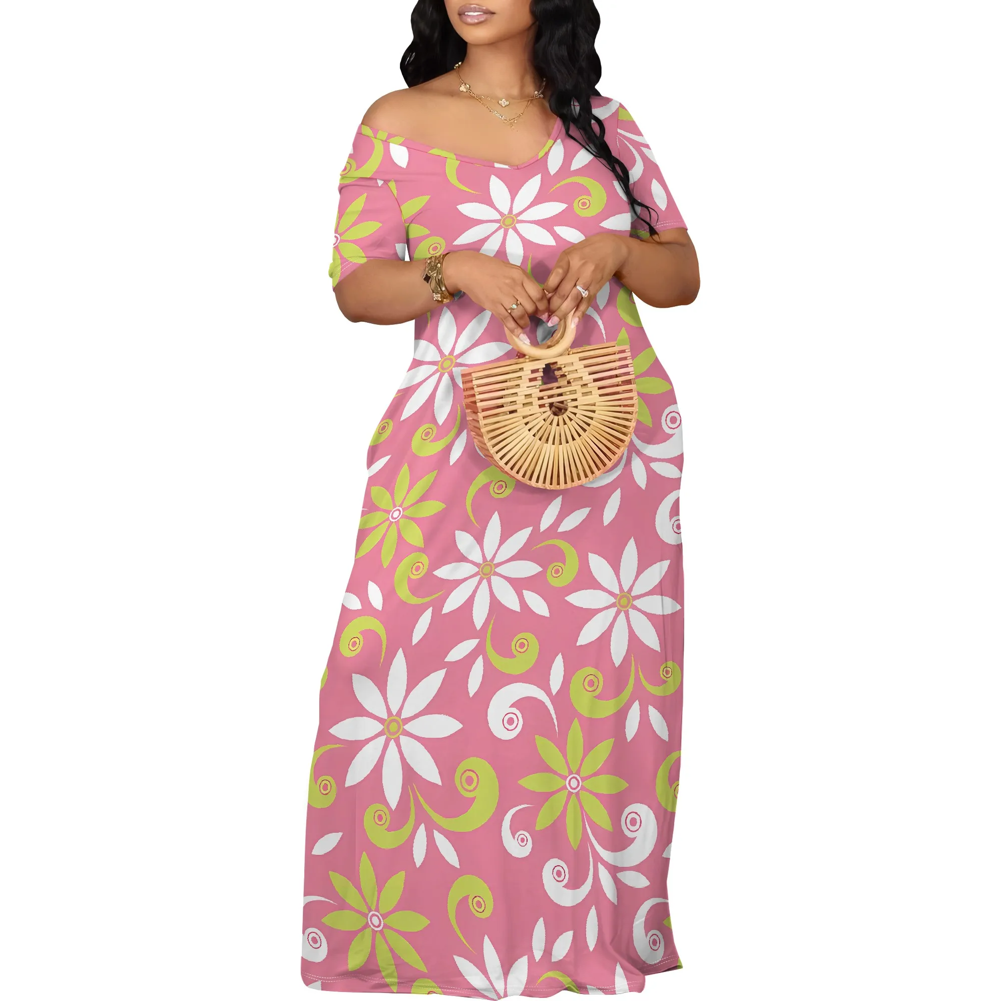 Summer Off Shoulder Maxi Dress Pink White Daisy Print Casual Beachwear