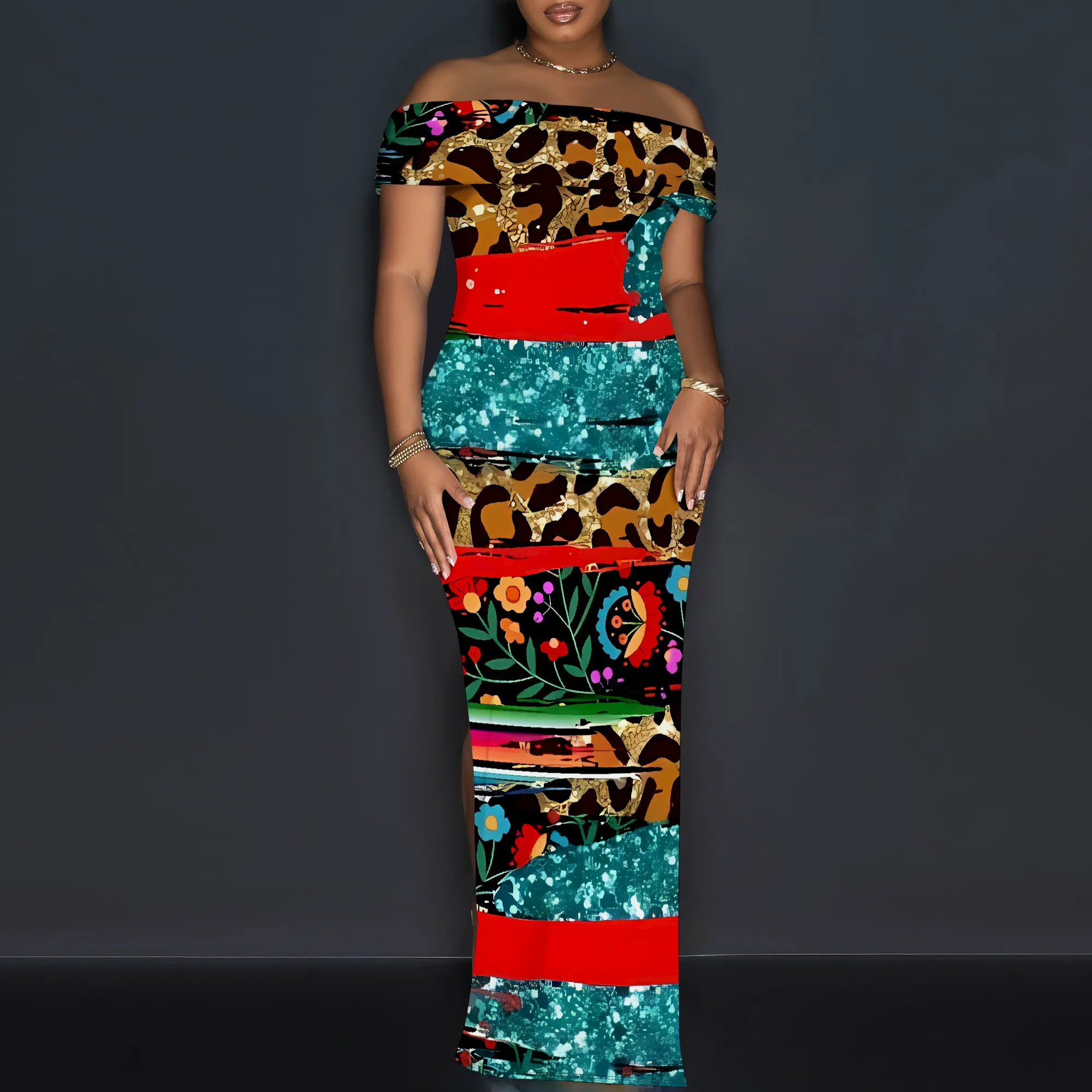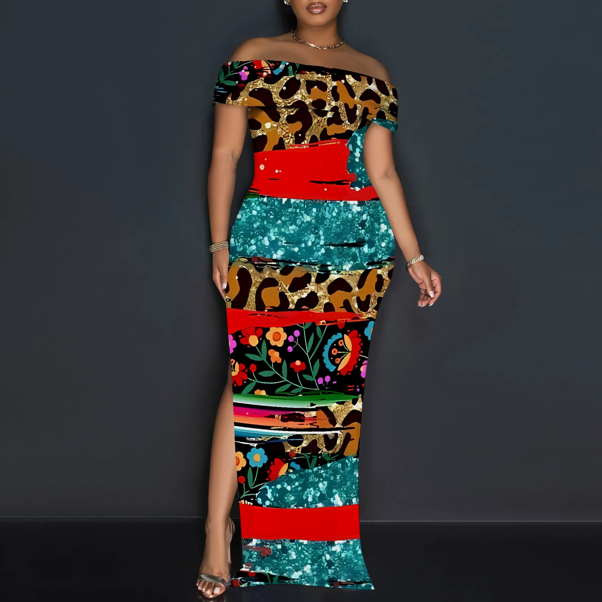 Tribal Patchwork Off Shoulder Maxi Dress Women Boho Style Slim Fit Slit Long Dress Party Clubwear