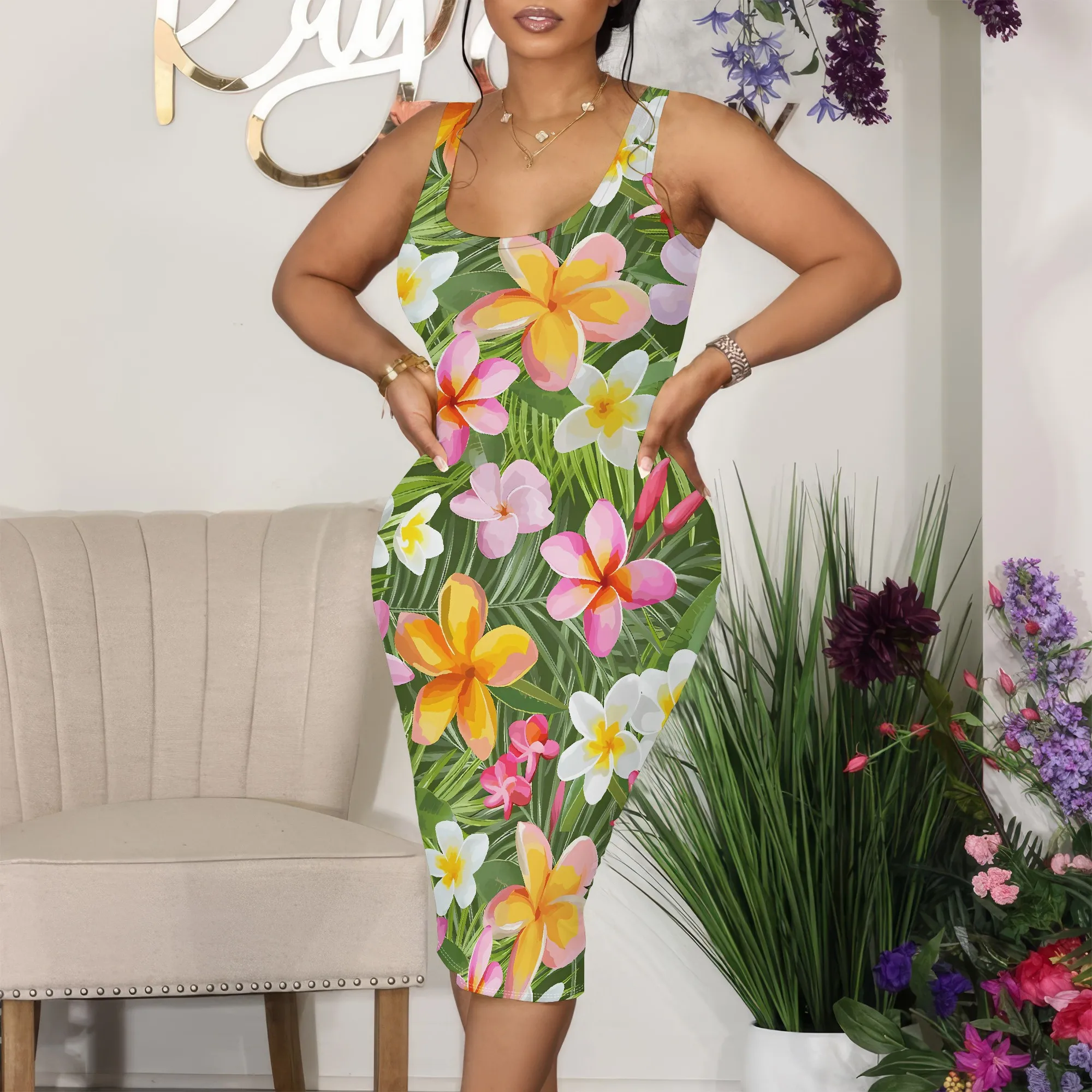 Tropical Floral Print Sleeveless Midi Dress for Women Sexy Summer Vacation Outfit