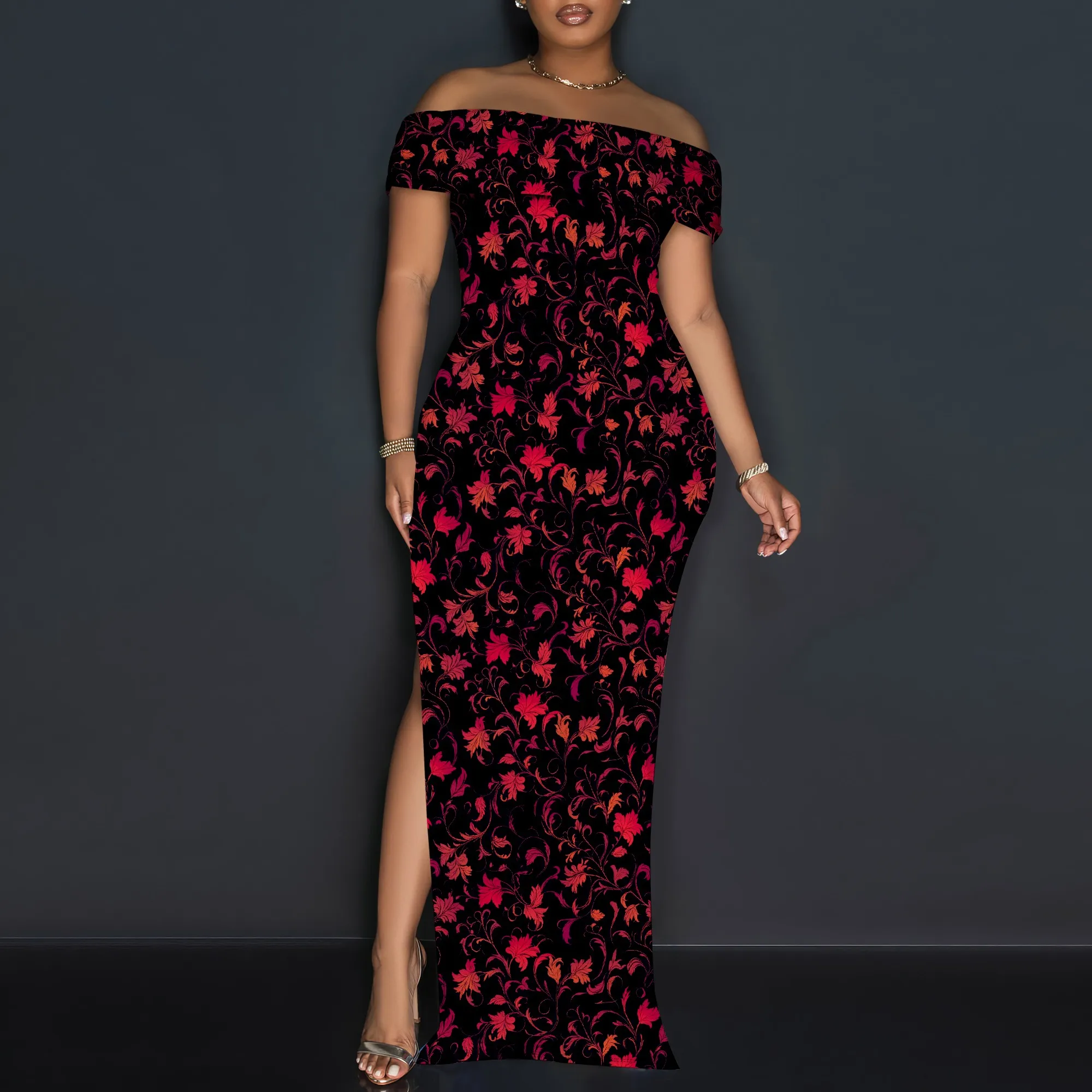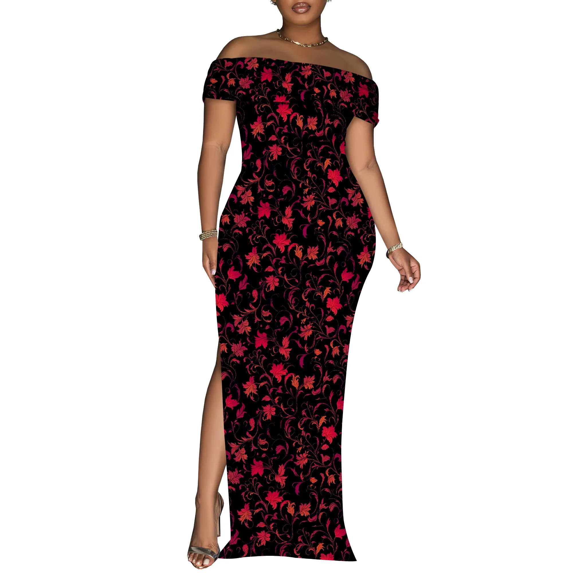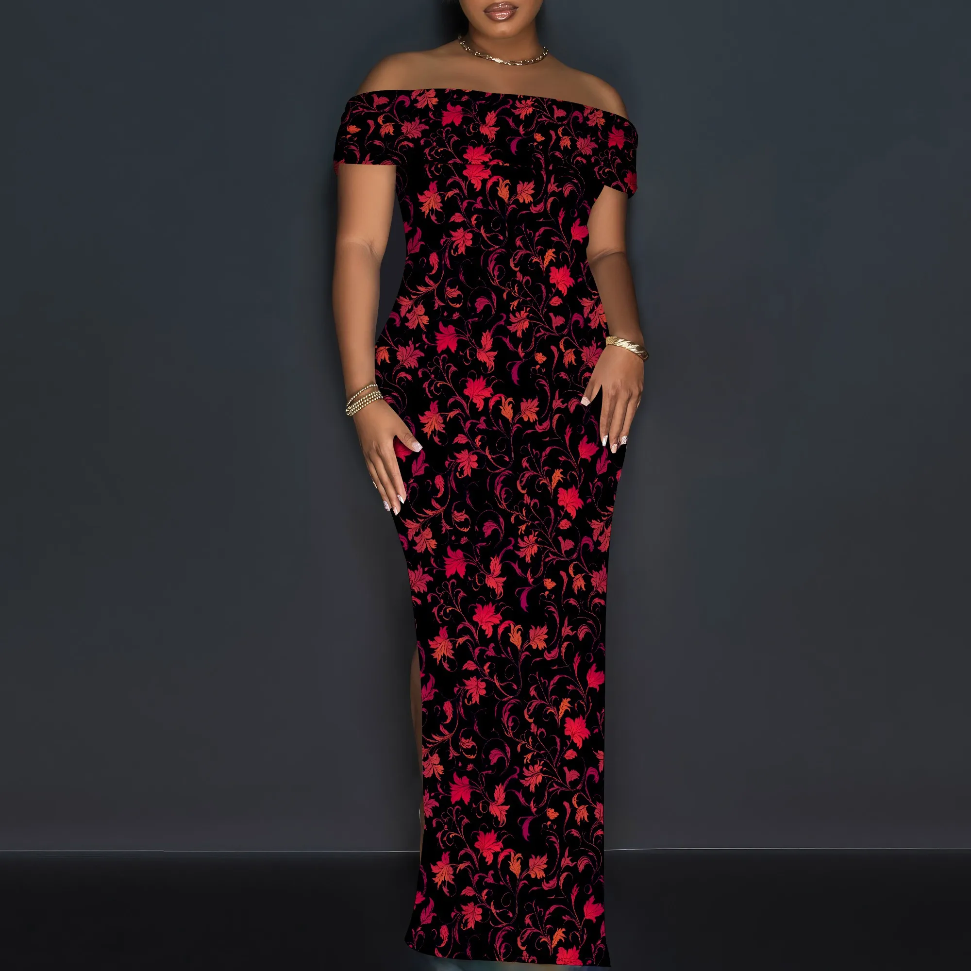Vintage Floral Off Shoulder Maxi Dress Women Elegant Red Print Bodycon Long Gown Evening Look