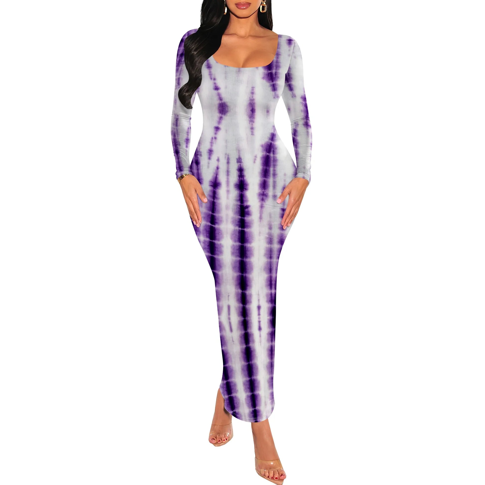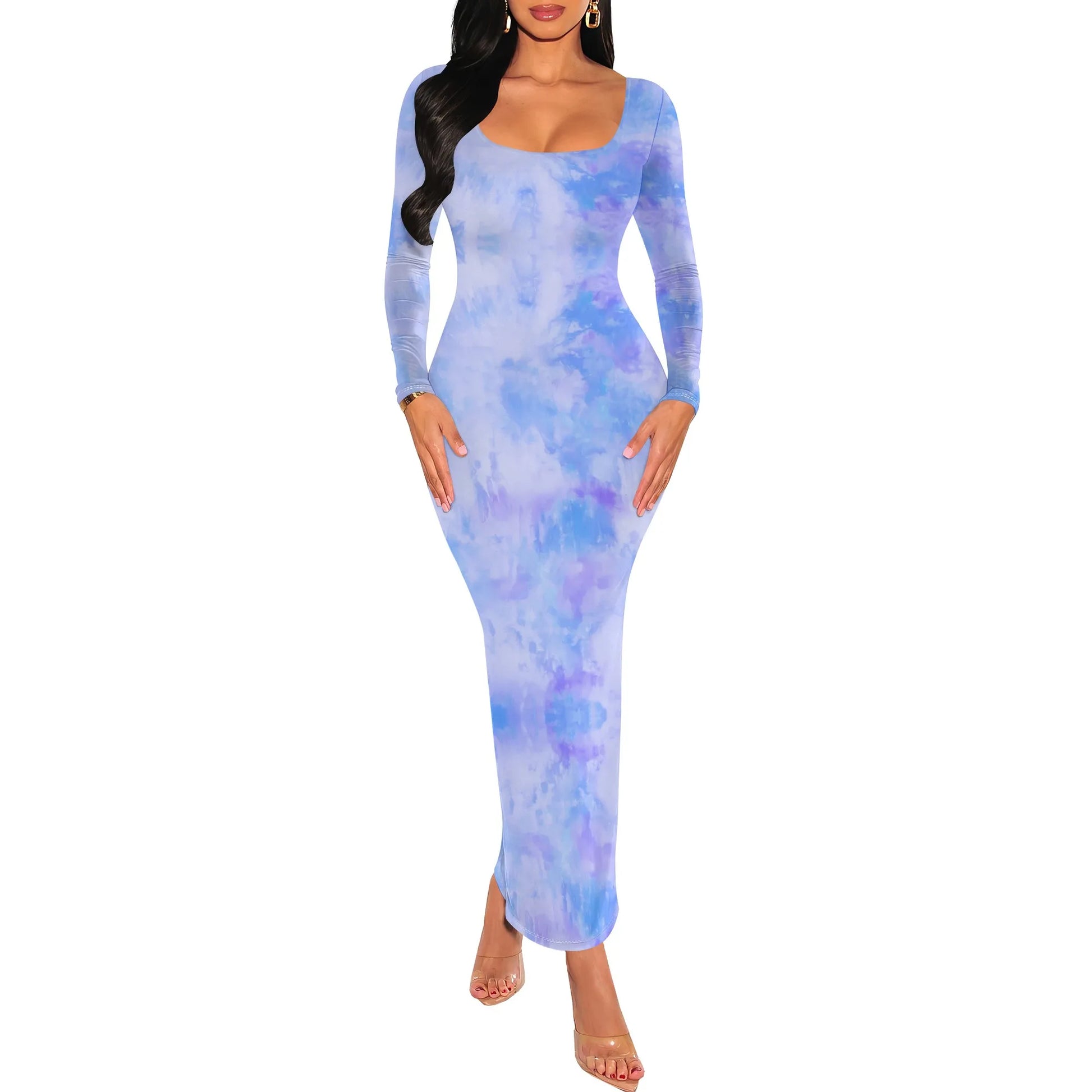 Women's Fall Trendy Dress Tie Dye Crew Neck Long Sleeve Bodycon Maxi Dress Casual Long Dresses